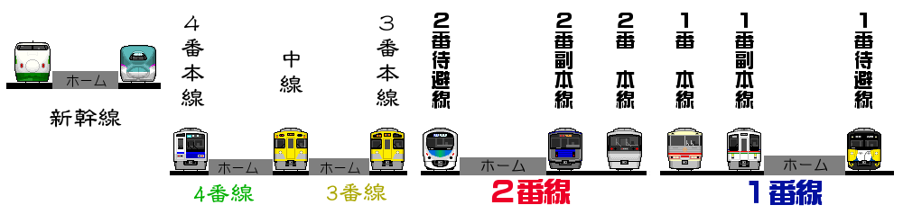 その代わり、外側の複線を新幹線対応にする(カーブ半径を少し大きめにする)ことで、1番線と2番線に新幹線が走行可能になります。